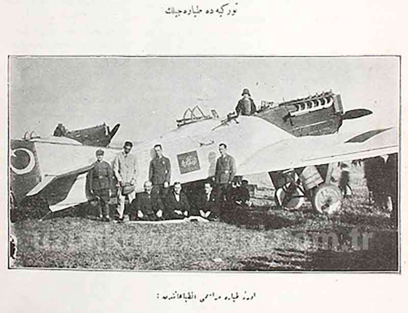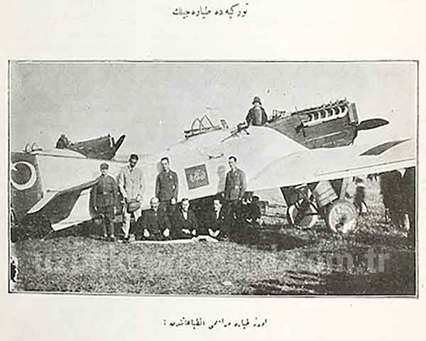 Sıra ile ayaktakiler: Sağdan îtibâren Edirne Tayyâre Cemiyeti Âzâsından Yüzbaşı İbrahim Bey, Râsıd Yüzbaşı Süreyyâ Bey, Uzunköprü Tayyâre Pilotu Rıdvan Bey, Yazıcısı Salim Efendi.